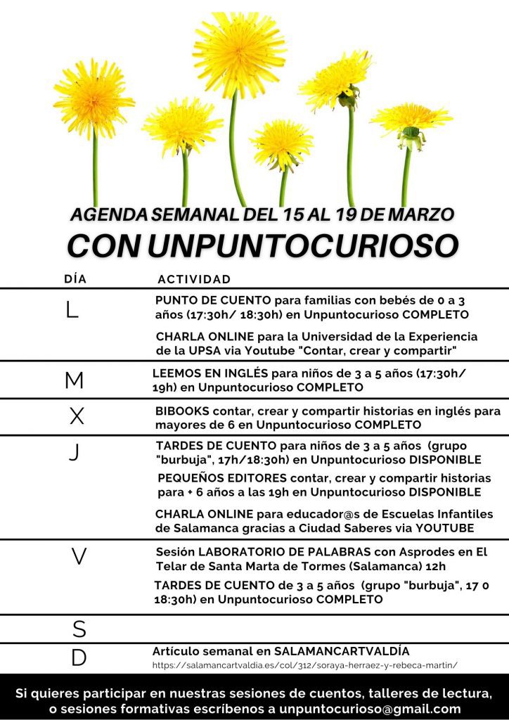 Otra semana mas para ir compartiendo momentos y creando nuevos recuerdos a vuestro lado. Además se deja sentir la primavera con los colores, texturas y paisajes característicos para animarnos a seguir hacia adelante. Compartimos aquí nuestra AGENDA CURIOSA de Salamanca y os recordamos que tenemos plazas para la actividad TARDES DE CUENTO (niños de 3 […]