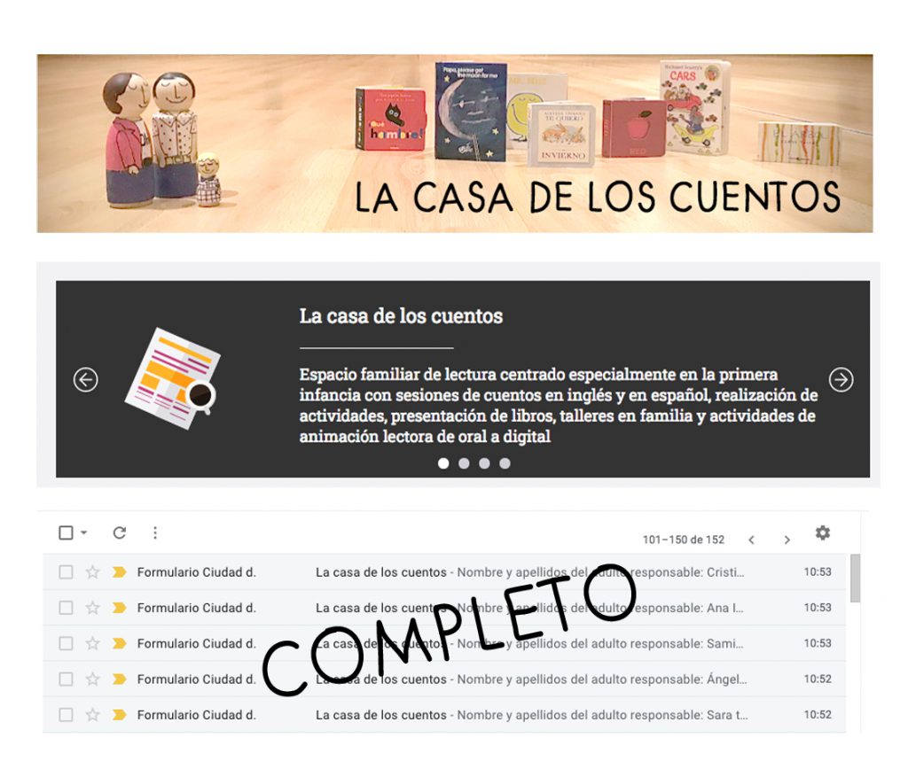 Esta mañana a las 10:30h desde Fundación Salamanca Ciudad de Cultura y Saberes. Área Educación se habilitó el formulario para apuntarse a las sesiones de CUENTOS Y TALLERES PARA FAMILIAS de la “CASA DE LOS CUENTOS” que llevaremos a cabo en la Sala de Ensayos del Teatro Liceo en Navidad. A las 11:45h TODAS LAS […]